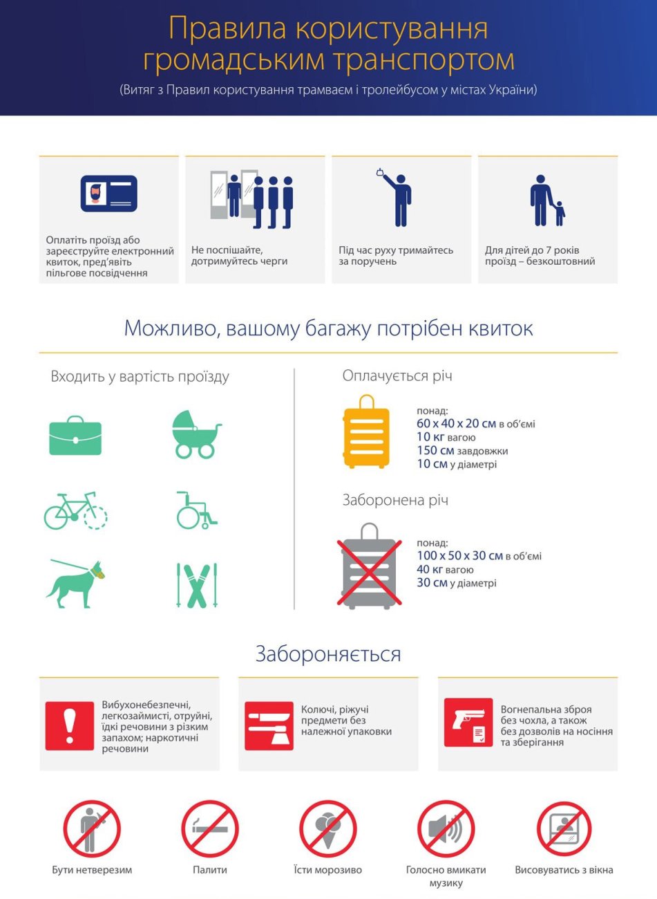 Перевезення багажу в громадському транспорті ЖитомираПеревезення багажу або ручної поклажі в громадському транспорті коштує як разовий проїзд. Якщо кількість багажу перевищує норму, то потрібно платити за кожну одиницю цього багажу. Пасажир може безкоштовно перевозити одну одиницю багажу, якщо його розміри не перевищують 60x40x20 сантиметрів, а вага – 10 кг. Щодо велосипедів, то їх можна перевозити безкоштовно лише у розібраному вигляді. Перевозити у салоні дозволено і тварин, але собаки обов’язково мають бути на повідку та у намордниках. Пільговий проїзд у міському транспорті не дає права безкоштовно перевозити багаж. У транспорті заборонено розміщувані багаж у тих місцях, де це заважає вільному пересуванню пасажирів уздовж салону. Не можна провозити вибухонебезпечні, легкозаймисті, отруйні, їдкі речовини з різким запахом та наркотичні речовини, колючі, ріжучі предмети без належної упаковки, вогнепальну зброю без чохлів та дозволів на носіння та зберігання. Забороняється їхати з громіздким багажем розміром більше ніж 100x50x30 см або вагою понад 40 кг, речами, довшими за 190 см та діаметром більше 30 см. Штраф за багаж накладається на підставі статті 134 адміністративного кодексу України. Від 0,5 до 1 неоподаткованого мінімуму доходів громадян. На сьогоднішній день це складає 8 грн 50 коп. |