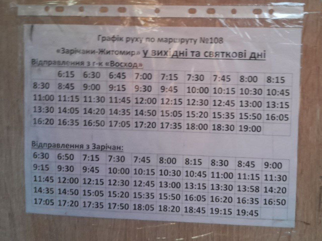 | № | Маршрут | Інтервал вдень, хв. | Інтервал ввечері, хв. | Початок руху | Кінець руху | Кількість на маршруті, вдень | Кількість на маршруті, ввечері | Докладні графіки | Інформація про перевізника | | 108 | ГК "Восход" - Зарічани | 11-12 | 20-30 | 06:15 | 21:00 | 7 | 4 | Переглянути | ФОП Савіцький Є.А. 12402, Житомирська обл., Житомирський р-н., с. Оліївка, провулок Луговий, буд. 2 | ГК "Восход" - вул. Якова Зайка - Київське шосе - вул. Київська - вул. Театральна - вул. Велика Бердичівська - вул. Жуйка - Бердичівське шосе - Зарічани. | | 110 | Соколовський масив - Станишівка | 15-20 | 15-20 | 06:00 | 22:00 | 9 | 9 | Графіки відсутні | ТОВ "САВ-ТРАНС" 10030, Житомирська обл., м. Житомир, вул. Східна, буд. 88/2 https://sav-trans.com.ua |