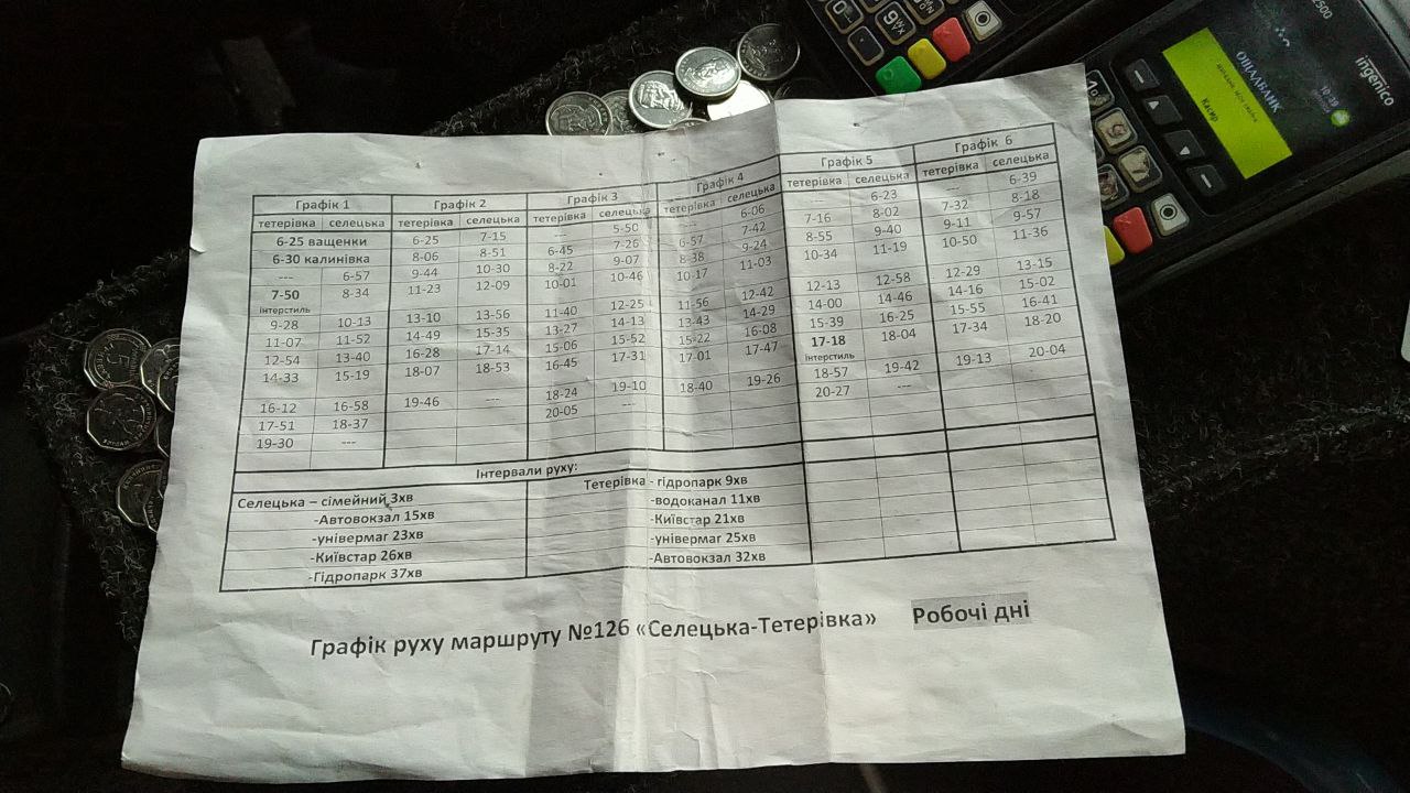 | № | Маршрут | Інтервал вдень, хв. | Інтервал ввечері, хв. | Початок руху | Кінець руху | Кількість на маршруті, вдень | Кількість на маршруті, ввечері | Докладні графіки | Інформація про перевізника | | 108 | ГК "Восход" - Зарічани | 15 | 15-30 | 06:15 | 20:00 | 6 | 6 | Переглянути | ФОП Савіцький Є.А. 12402, Житомирська обл., Житомирський р-н., с. Оліївка, провулок Луговий, буд. 2 | | 110 | Соколовський масив - Станишівка | 20-25 | 20-25 | 06:00 | 22:00 | 7 | 7 | - | ТОВ "САВ-ТРАНС" 10030, Житомирська обл., м. Житомир, вул. Східна, буд. 88/2 https://sav-trans.com.ua | | 115 | Автостанція "Житній ринок" - Озерне | 15-25 | 15-35 | 05:00 | 22:30 | 6 | 6 | Переглянути | | 121 | Глибочиця - Станишівка | 20-40 | 20-50 | 06:20 | 21:20 | 5 | 5 | Переглянути | ФОП ВОРОБЙОВА Н.П. 10030, м.Житомир, вул Чапаева 18, кв.71 (099) 529-43-27 | | 123 | Глибочиця - Іванівка | 25-30 | 25-30 | 06:00 | 21:00 | 6 | 6 | Переглянути | ТОВ "САВ-ТРАНС" 10030, Житомирська обл., м. Житомир, вул. Східна, буд. 88/2 https://sav-trans.com.ua | | 126 | Селецька - Тетерівка (деякі рейси прямують до Гідропарку) | 10-11 | 10-11 | 06:00 | 21:20 | 5/4 | 5/4 | Переглянути (126) | | 147 | м-н Путятинський - Довжик (деякі рейси прямують до Барашівки) | 15-20 | 15-02 | 06:00 | 20:30 | 6 | 6 | Переглянути графіки руху | | Загалом: | 45 | 45 |