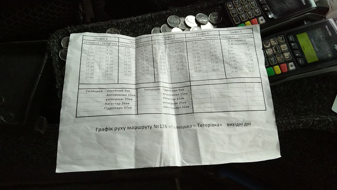 | | 126 | Селецька - Тетерівка (деякі рейси прямують до Гідропарку) | 8-9 | 8-9 | 06:00 | 21:30 | 6/5 | 6/5 | Переглянути (126) | | Вул. Селецька - вул. Вітрука - залізничний вокзал - автовокзал - вул. Київська - вул. Леха Качинського - вул. Чуднівська - Гідропарк - Чуднівське шосе - с. Тетерівка | | 147 | м-н Путятинський - Довжик (деякі рейси прямують до Барашівки) | 8-10 | 8-10 | 06:00 | 21:00 | 12 | 12 | Переглянути графіки руху | | майдан Путятинський - вул. Святослава Ріхтера - вул. Льва Толстого - вул. Велика Бердичівська - вул. Перемоги - проспект Миру - Довжик. | | Загалом: | 58 | 55 |