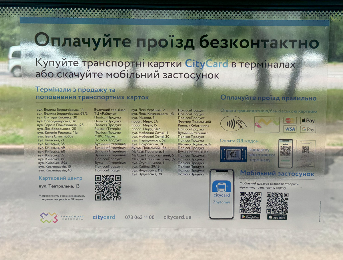 1. Оплатити проїзд у міському громадському транспорті Житомира можна за допомогою банківської картки або NFC, однак нещодавно виявилося, що це можливо не завжди. У міській раді повідомляють, що в разі виникнення блекауту у громадському транспорті буде діяти лише транспортна картка. Це означає, що оплата готівкою недоступна, а банківська картка приймається до оплати валідатором лише при наявності інтернет-зв'язку. В результаті залишаються лише два способи оплати - транспортна картка або QR-код у додатку CityCard. Варто відзначити, що раніше під час блекаутів старі валідатори працювали без змін і приймали всі види оплати.
