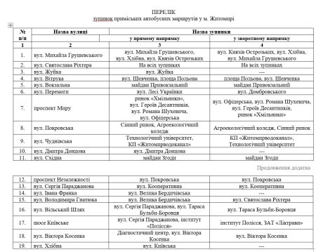 У додатку є перелік зупинок на 19 вулицях, на двох центральних – Київській та Великій Бердичівській – зупинки приміських маршруток (з тризначними номерами) не передбачені.