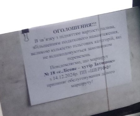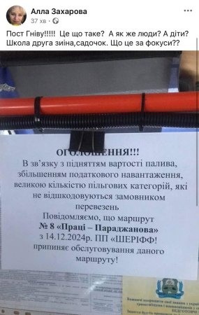 Житомиряни в громадському транспорті почали звертати увагу на нові оголошення про припинення роботи окремих автобусних маршрутів. Зокрема, з 14 грудня 2024 року перевізник ПП "Шеріфф" планує зупинити обслуговування маршрутів № 8 (Праці – Параджанова) та № 18 (с. Лісове – Затишшя).