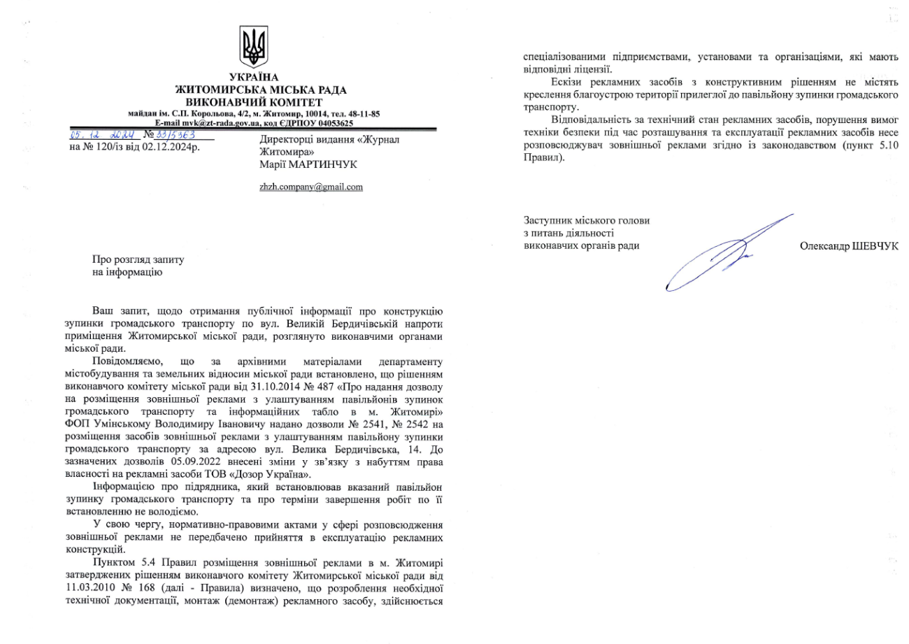 У відповіді на запит йдеться, що 31 жовтня 2014 року дозвіл від міськвиконкому на розміщення реклами з облаштуванням павільйону зупинки громадського транспорту по вулиці Великій Бердичівській, 14 отримав ФОП Умінський Володимир Іванович. А інформацією про підрядника, який встановлював павільйон зупинки, у міській раді не володіють. Окрім того, вказано, що ескізи рекламних засобів із конструктивним рішенням не містять креслення благоустрою території, прилеглої до павільйону зупинки громадського транспорту, а відповідальність за технічний стан рекламних засобів та порушення вимог техніки безпеки під час їх встановлення та експлуатації несе розповсюджувач рекламних засобів.