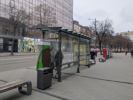 Журналісти відвідали ще одну подібну зупинку в Житомирі — по вулиці Київській поблизу ЦУМа. На фото видно, що її конструкція дещо відрізняється, зокрема, відсутні проміжок між бетонною частиною зупинки і плиткою.