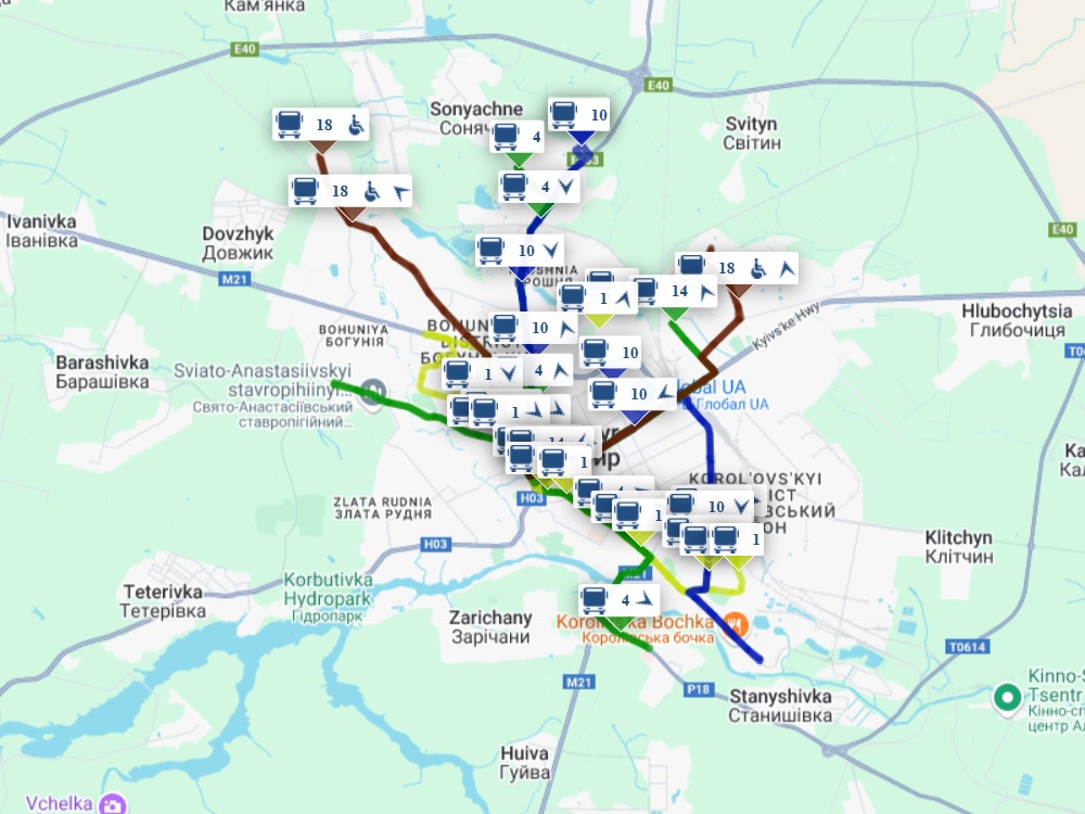 - Актуальна інформація про діючі маршрути, схеми руху, зупинки.