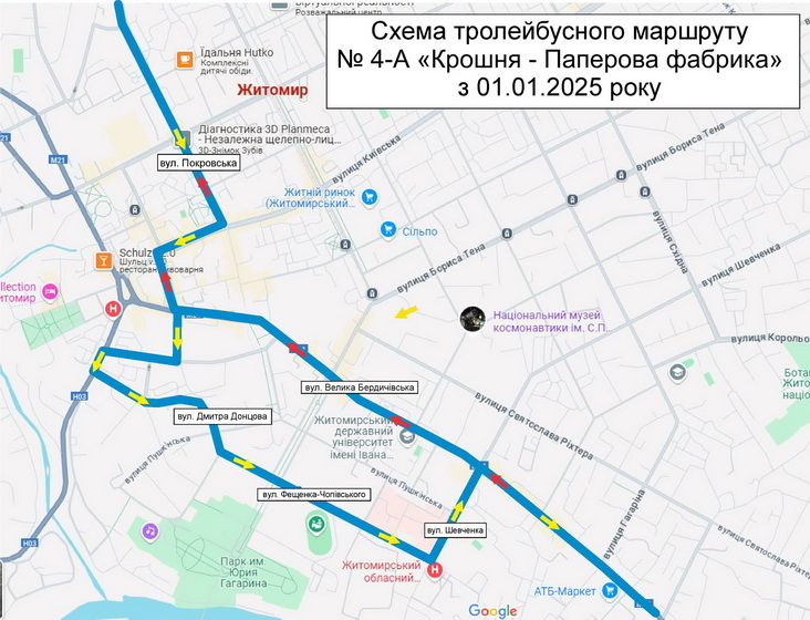 «Зважаючи на численні звернення мешканців вулиць Фещенка-Чопівського, Синельниківської та прилеглих територій щодо відсутності транспортного сполучення у напрямку вул. Велика Бердичівська, із 01.01.2025 року КП «ЖТТУ» міської ради вносить зміни до маршруту тролейбуса № 4А «Крошня – Паперова фабрика», - йдеться в повідомленні Житомирської міської ради.