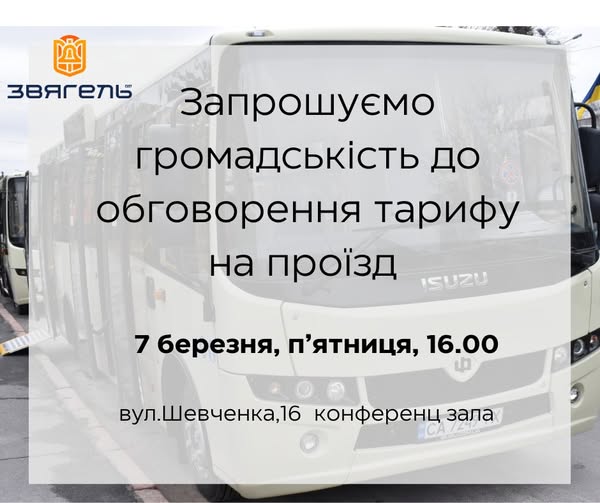Запрошують мешканців громади долучитись до обговорення вартості послуг на перевезення пасажирів автомобільним транспортом на міських автобусних маршрутах загального користування у Звягельській громаді, яке відбудеться 07.03.2025 р. о 16:00 год. у конференц залі Будинку рад за адресою вул. Шевченка, 16.
