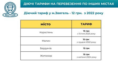 До виконавчого комітету Звягельської міської ради надійшли звернення перевізників щодо підняття вартості проїзду у громадському транспорті Звягеля. Станом на сьогодні тариф на перевезення пасажирів по місту Звягель становить – 12,00 грн.