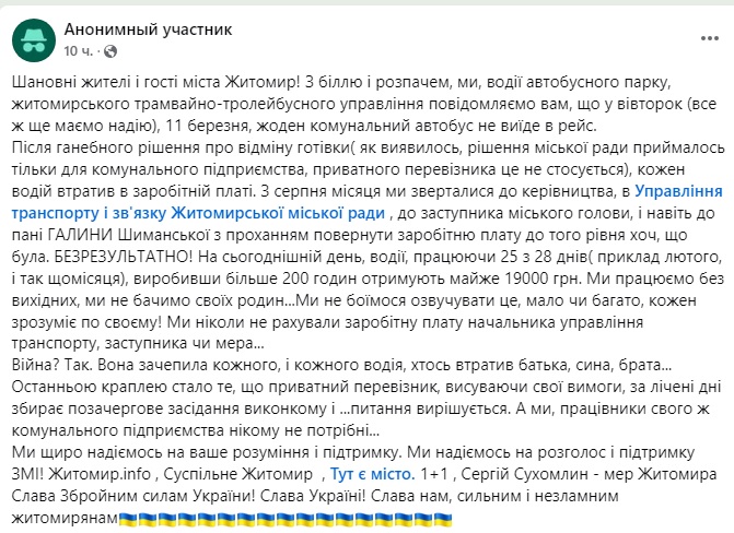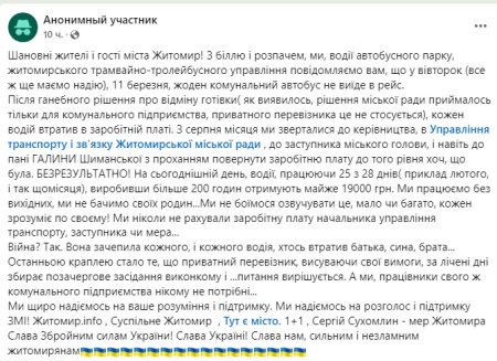"З серпня місяця ми зверталися до керівництва, в Управління транспорту і зв'язку Житомирської міської ради, до заступника міського голови, і навіть до пані ГАЛИНИ Шиманської з проханням повернути заробітню плату до того рівня хоч, що була. БЕЗРЕЗУЛЬТАТНО!" - йдеться в дописі.