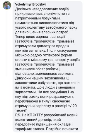 "Декілька незадоволених водіїв, прикриваючись анонімністю та патріотичними лозунгами, намагаються висловлюватися від усього колективу автобусного парку для вирішення власних потреб. Тепер щодо зарплат: всі водії (автобусів, тролейбусів і трамваїв) отримували доплату за продаж квитків за готівку. Після скасування міською радою готівкової форми оплати в міському транспорті у водіїв (автобусів, тролейбусів і трамваїв) зменшився обсяг роботи і, відповідно, зменшилась зарплата.