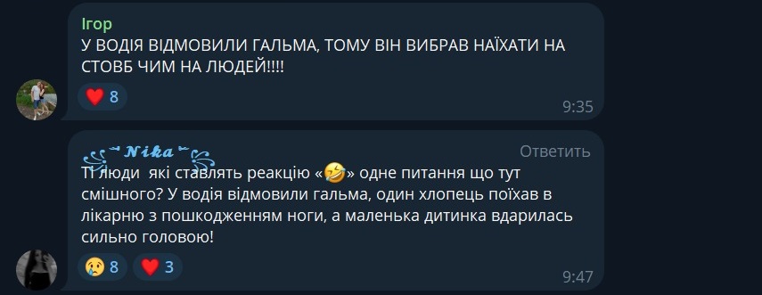 "У водія відмовили гальма, один хлопець поїхав в лікарню з пошкодженням ноги, а маленька дитинка вдарилась сильно головою" - пишуть у коментарях.