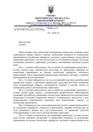 Нагадаємо, 27 лютого житомирянин створив петицію з вимогою недопустити шантаж приватним перевізником громади міста.