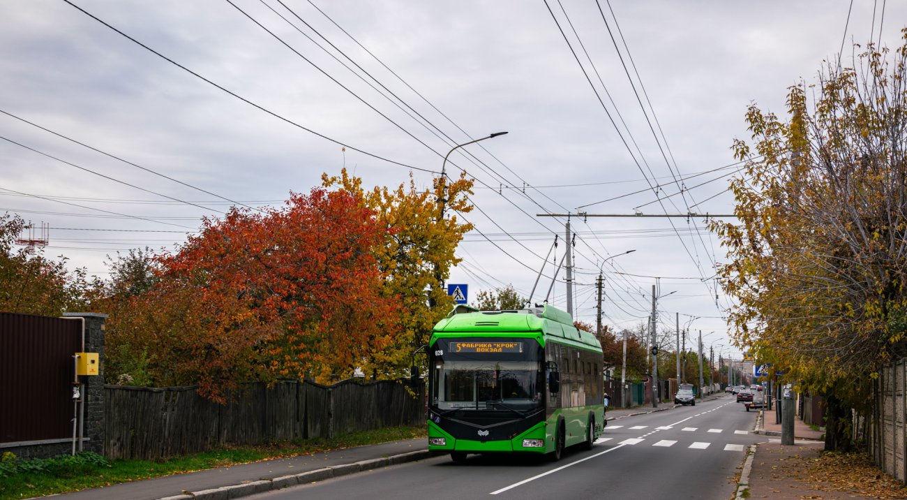 Тролейбус № 5 рухається вулицею Героїв Пожежних у напрямку вулиці Чуднівської. Автор світлини - Грашик, 29 жовтня 2024 р.