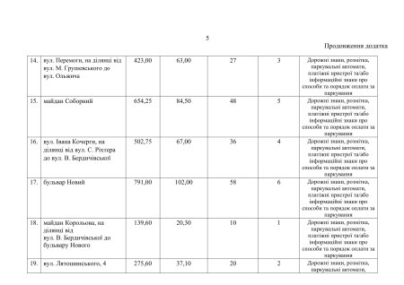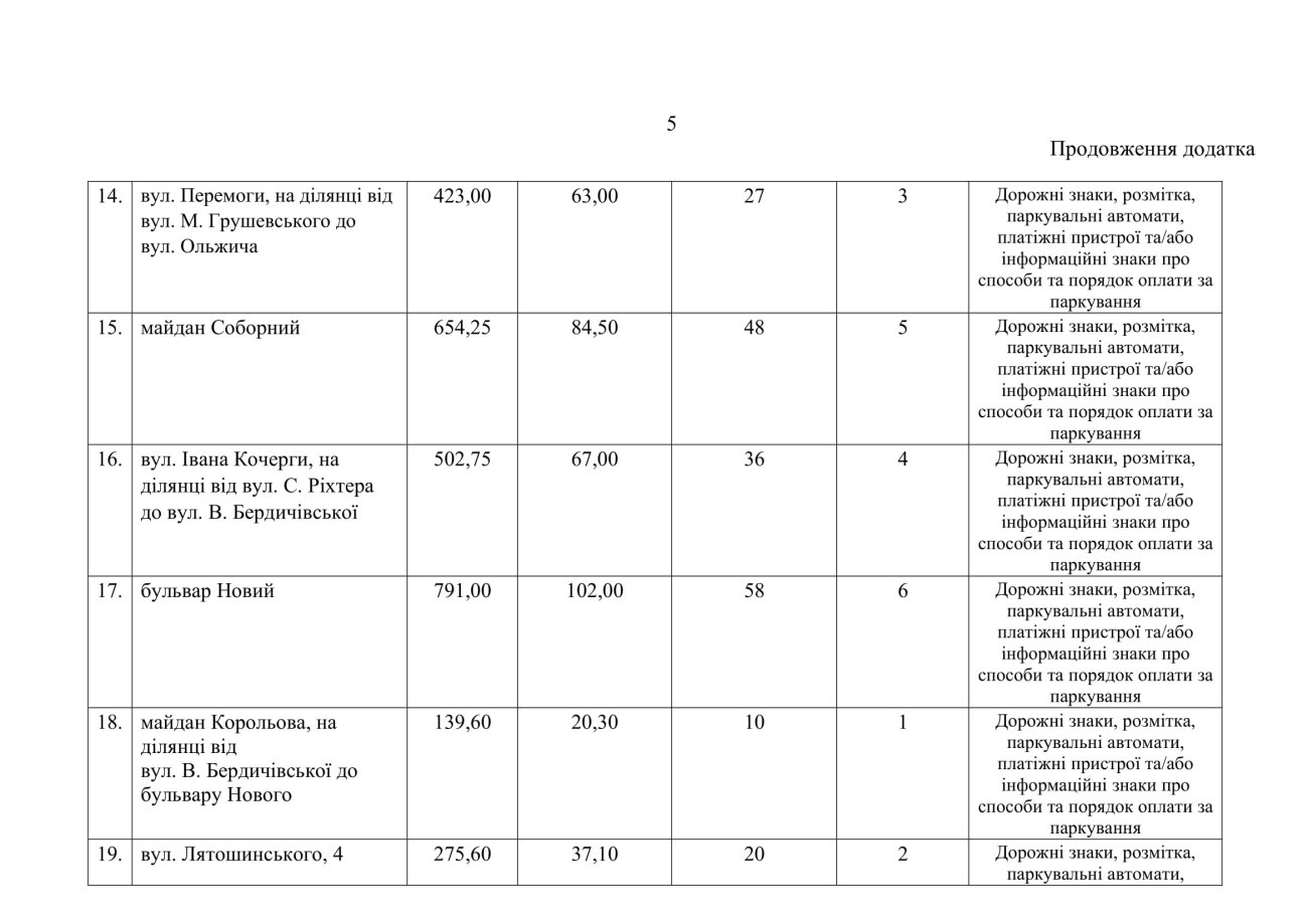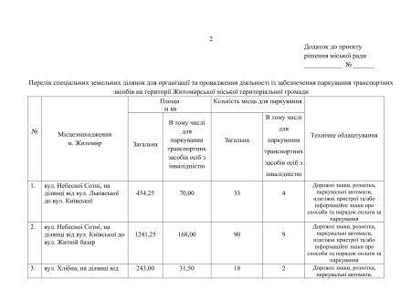Попередній перелік місць розміщення майданчиків для платного паркування у Житомирі: