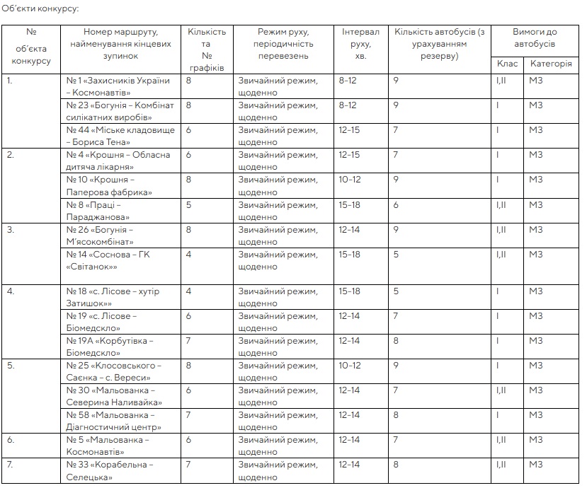 На конкурсі планують обрати перевізників для 14 діючих та 2 нині не діючих автобусних маршрутів, згрупувавши їх у сім пакетів по 1-3 маршрути. Тобто перевізник має подавати документи одразу на декілька маршрутів, серед яких є як "прибуткові", так і "збиткові" з меншим пасажиропотоком. Окремо по одному в пакеті виділили лише маршрути №5 та №33.