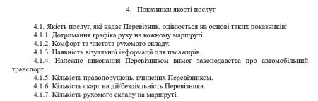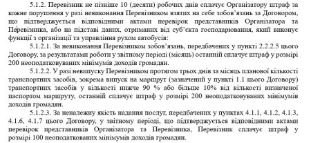 Проєкт договору про організацію перевезення пасажирів на автобусних маршрутах загального користування у Житомирській міській територіальній громаді, окрім стандартних положень, містить і такі умови: