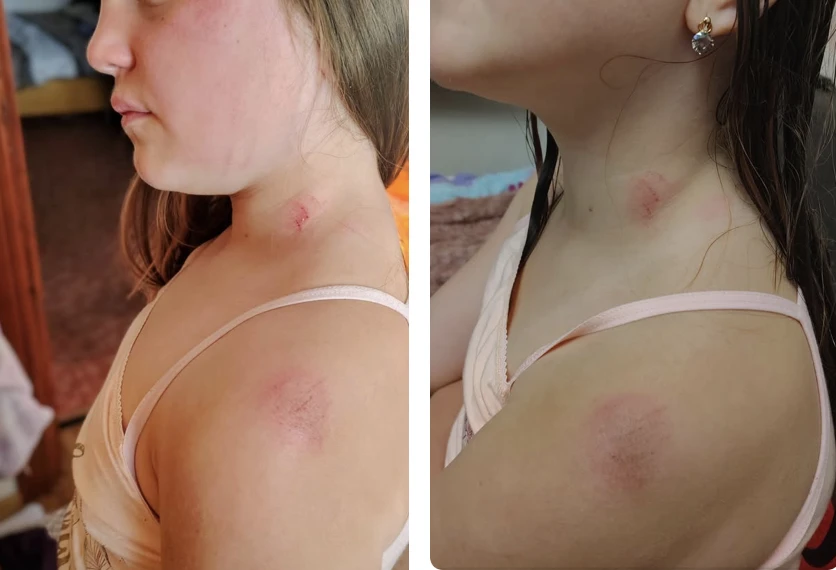 Журналісти Житомир.info 23 вересня зустрілися з мамою дитини. Вона розповіла, що все трапилося, коли Альбіна з однокласницею йшла тротуаром до дитячого майданчика. Жінка показує фото доньки, зроблені після інциденту, на тілі видно подряпини та синці.