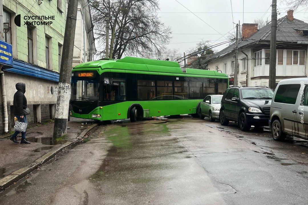 Начальник Житомирського трамвайно-тролейбусного управління Сергій Лазарєв розповів журналістам Суспільного, що причиною виникнення ситуації стало припарковане авто, яке не дозволяло тролейбусу здійснити маневр і продовжити рух.