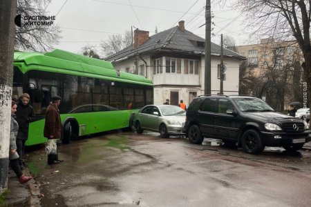 Вдень 21 листопада, виїжджаючи з вулиці Любарської на вулицю Малу Бердичівську, тролейбус перекрив дорогу, бо не міг проїхати через припарковане авто. Дорога була перекрита до моменту, поки не знайшли водія автівки.