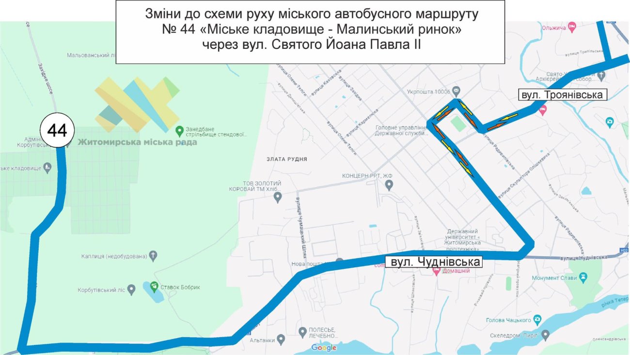 З 10 квітня міський автобусний маршрут № 44 «Корбутівка (Міський цвинтар) — Малинський ринок» перенаправили з вулиці Троянівської на вулицю Святого Йоана Павла II.