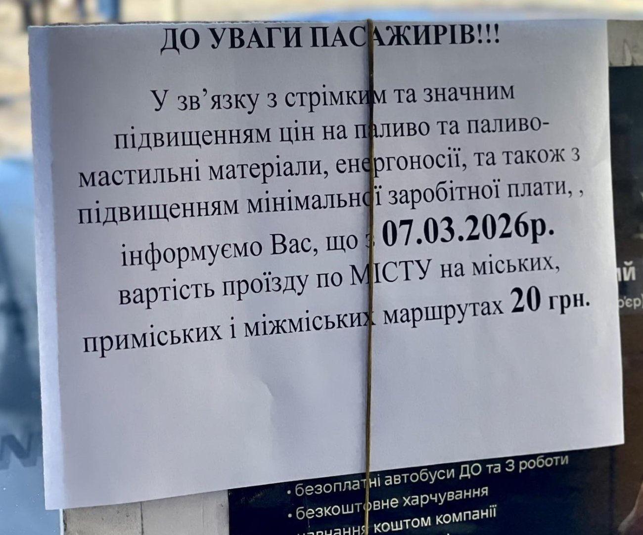 У салонах автобусів приватних перевізників уже з’явилися оголошення про підвищення вартості проїзду з 15 до 20 гривень із 7 березня 2026 року. Йдеться насамперед про оплату готівкою, яку виконавчий комітет Житомирської міської ради фактично не регулює.