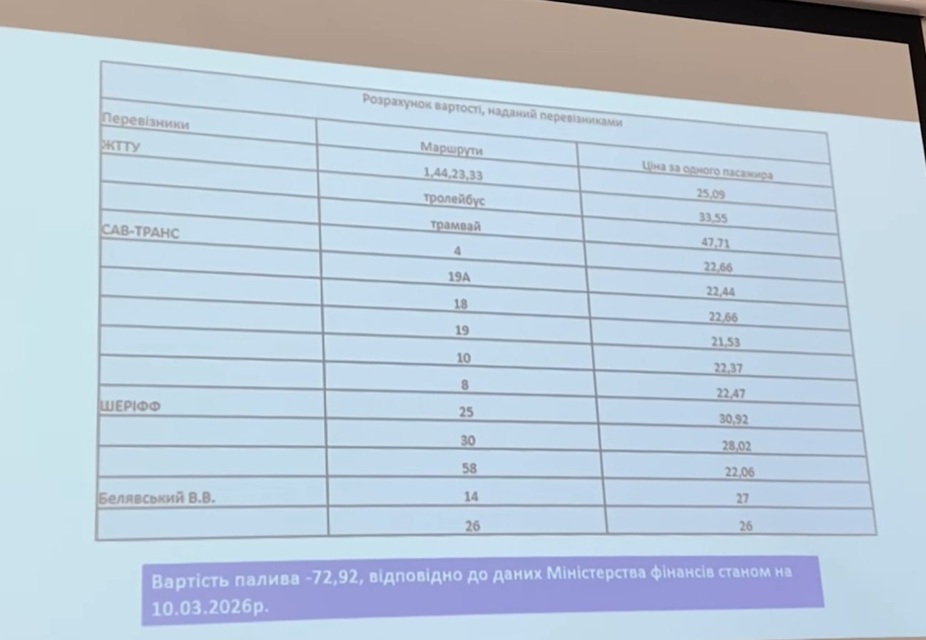 «Якщо говорити за електроенергію, комунальне підприємство закуповувало у 2025 році за середнім показником 9 грн 55 коп., а з початку 2026 року ми маємо зростання, і вартість коливається практично щоденно. Зараз вартість електроенергії – 16 грн 81 коп. в середньому за останні 2 місяці. Вартість, яка є в розрахунках, навіть не досягає тієї ціни, яка на сайті Міністерства фінансів – 74 грн. Вартість кожним перевізником надалі розраховувалася, розрахунки перерахувалися управлінням транспорту. Коригування тарифів – це вимушений крок через складну ситуацію на ринку вартості паливно-мастильних матеріалів, енергетики», – пояснив Олександр Шевчук.