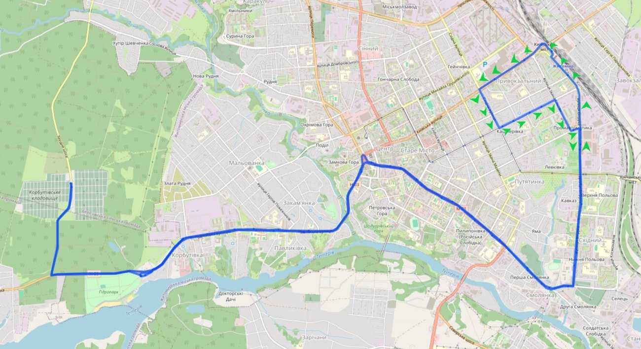 Тролейбус №15А курсуватиме за зміненим маршрутом: від центрального універмагу до Гідропарку (ЦУМ — вул. Київська — вул. Театральна — вул. Мала Бердичівська — вул. Леха Качинського — вул. Чуднівська — Гідропарк).