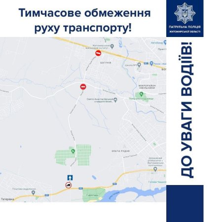 Нагадаємо, у Провідну неділю, 19 квітня, з 07:00 у районі Корбутівського кладовища рух автомобільного транспорту Західним шосе здійснюватиметься в односторонньому напрямку — від Чуднівського шосе у напрямку Богунії (до вул. Соснової). Вантажні транспортні засоби та спецтехніка будуть перенаправлені через місто Житомир.