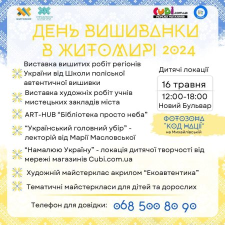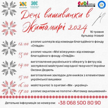 Що стосується Житомира, то на День вишиванки житомирян чекають фотозона, виставки та майстер-класи.