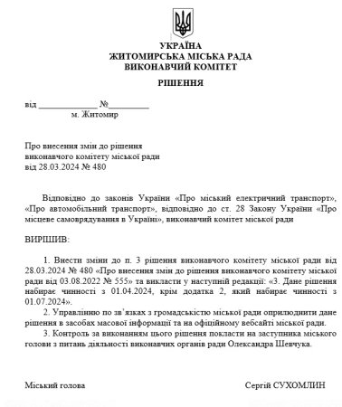 «Внести зміни до п. 3 рішення виконавчого комітету міської ради від 28.03.2024 № 480 «Про внесення змін до рішення виконавчого комітету міської ради від 03.08.2022 № 555» та викласти у наступній редакції: «3. Дане рішення набирає чинності з 01.04.2024, крім додатка 2, який набирає чинності з 01.07.2024», - йдеться у проєкті рішення.